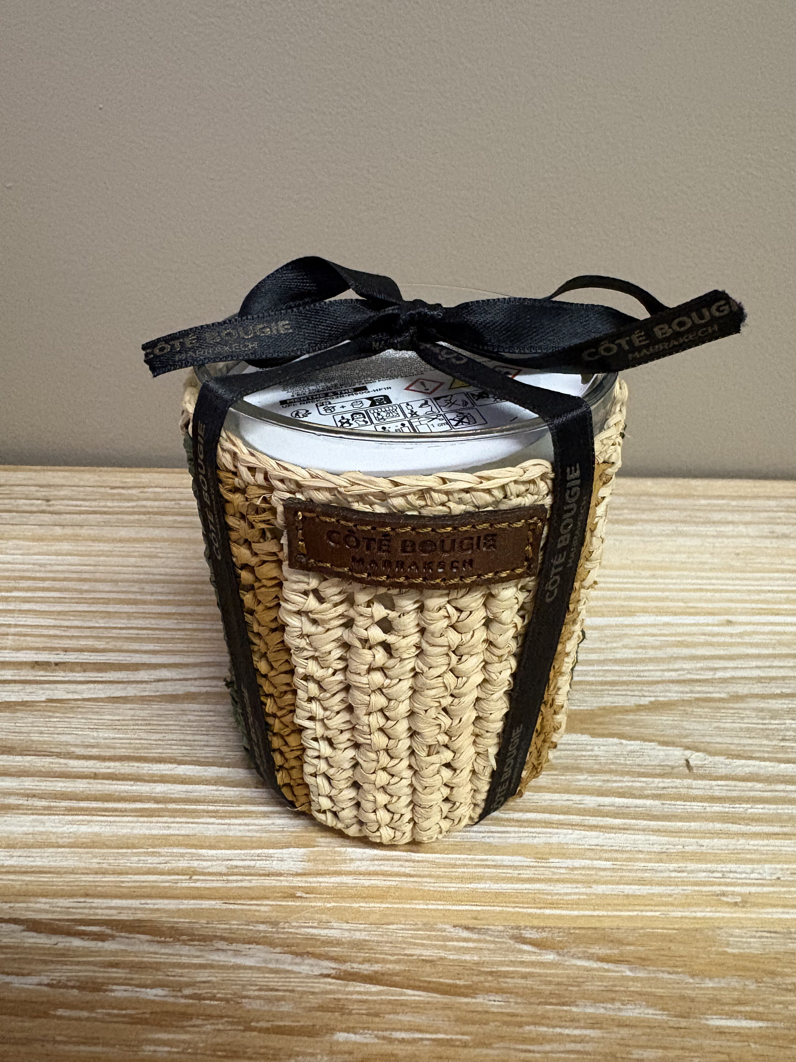 La Bougie parfumée Raphia Maya illustre l’alliance parfaite entre authenticité et fraîcheur. Chaque pot est orné de raphia tressé ou crocheté à la main par une coopérative féminine à Essaouira, où perdure un savoir-faire ancestral transmis de génération en génération.